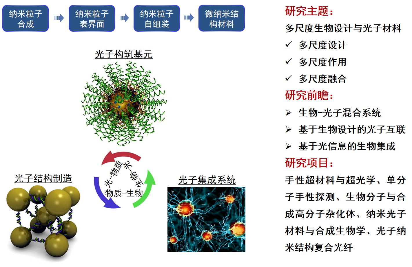 我们的研究方向包括:1、纳米生物技术;2、微纳米结构材料;3、光学与光子学。利用不同尺度的仿生原理以及生物设计与制造方法,研究具有光学特性纳米粒子的合成、表界面、自组装及其微纳米结构材料的性质表征与调控,将材料与生物系统相似的多尺度性关联起来,推动形成光子功能材料的多尺度设计新原理与新概念。将在单颗粒、单纳米结构、单细胞不同尺度揭示光、物质、生物之间的复杂相互作用,为探索在生物光子集成芯片、仿生纳米光子机器、纳米生物医学等领域的前沿应用打下基础。